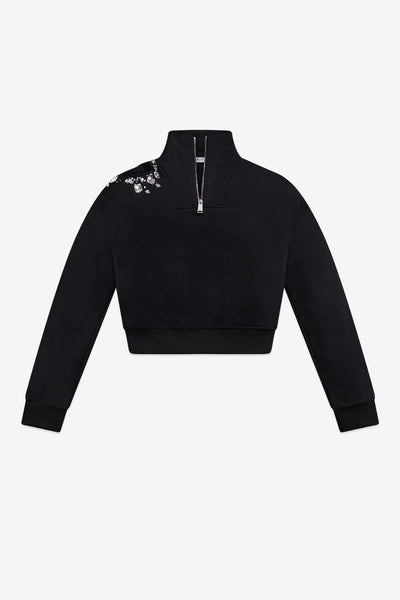 French terry sweat skort with crystal cluster cutout at leg. Available in Black.