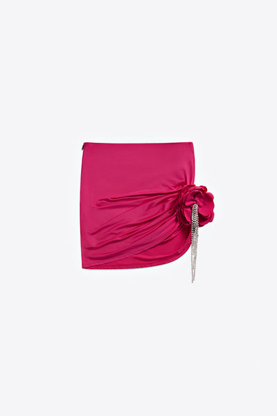 Jersey crewneck long sleeve shirt featuring draped waist and crystal flower embellishment. Available in Fuchsia & Black.
